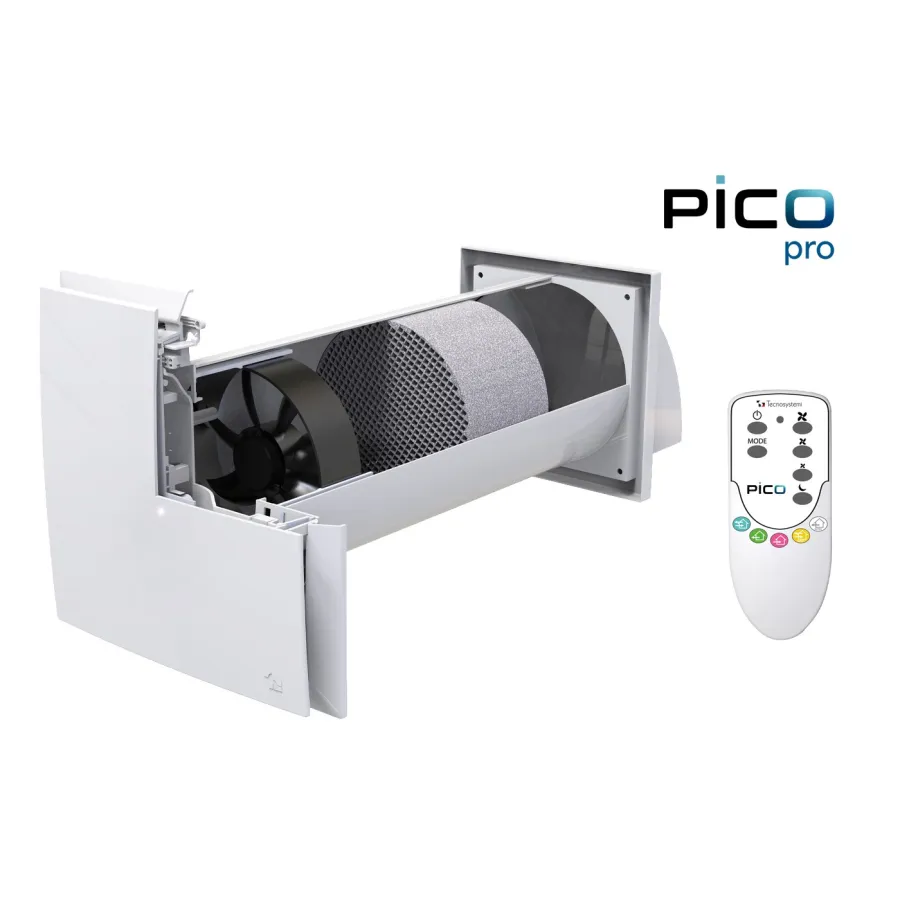 PICO PRO è un innovativo sistema progettato per migliorare il comfort termico e la qualità dell'aria all'interno degli ambienti residenziali. PICO PRO è in grado di operare in entrambe le direzioni, il che significa che può essere utilizzato per ventilare e recuperare il calore dell’ambiente secondo le necessità. Questo consente di mantenere un microclima confortevole in ogni stagione. Risparmio Energetico: Questo sistema è progettato per massimizzare il risparmio energetico, riducendo così i costi associati al riscaldamento e al raffrescamentodegli spazi interni. Grazie al suo funzionamento efficiente, contribuisce a ridurre l'impatto ambientale. Ventilazione Ottimizzata: PICO PRO garantisce una ventilazione efficace e un adeguato ricambio d'aria all'interno dei locali, migliorando la qualità dell'aria econtribuendo al benessere degli occupanti. Elevato Rendimento: L'aspiratore-estrattore integrato in PICO PRO offre un elevato rendimento, con la capacità di estrazione che può raggiungere fino al 90%. Ciò è reso possibile dalla presenza di uno scambiatore di calore a struttura alveolare realizzato in materiale ceramico, il che massimizza l'efficienza termica. Facile Installazione e Manutenzione: PICO PRO è progettato per essere installato con facilità e richiede una manutenzione semplice. Questo semplifica lagestione del sistema, riducendo i costi di manutenzione nel tempo. La connessione alla rete elettrica al dispositivo viene effettuata direttamente dalla predisposizione a morsetto integrato nel cruscotto a muro, per assicurare un assemblaggio e una manutenzione rapida del PICO.