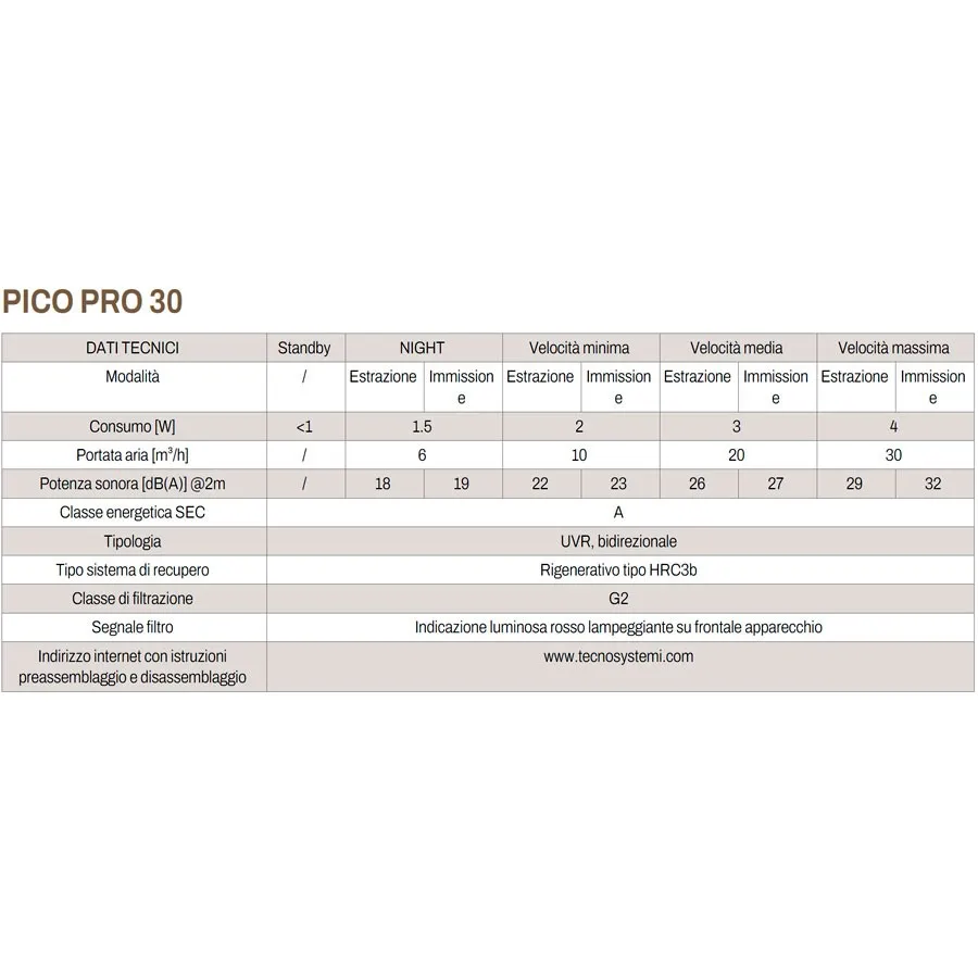 Ventilatore posizionamento A parete Tecnosystemi PICO PRO 30, 32 dBA pressione sonora , 4 W potenza totale, 30 m3/h portata aria, classe energetica A, 50 cm lunghezza, 25 cm larghezza, 25 cm altezza - ACD100056