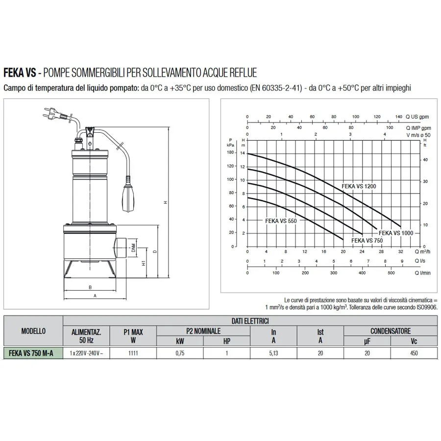 Protezione termo-amperometrica di serie. Condensatore permanentemente inserito. Servizio continuo con liquido a 35 °C e pompa totalmente immersa. Numero di poli: 2. Max avviamenti/ora: 20. Costruzione secondo normative CEI 2-3CEI 61-69 (EN 60335-2- 41).