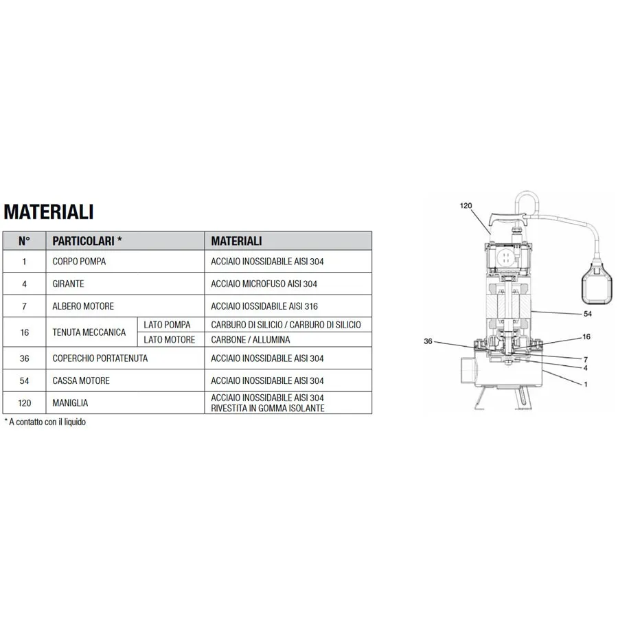 Corpo pompa, coperchio portatenuta, cassa motore, calotta con maniglia in acciaio inossidabile AISI 304. Girante in acciaio microfuso. Maniglia rivestita in gomma isolante. Albero motore in acciaio inossidabile AISI 316. Tenuta meccanica doppia con camera d'olio interposta (olio atossico), in carbone/allumina lato motore e carburo di silicio/carburo di silicio lato pompa.