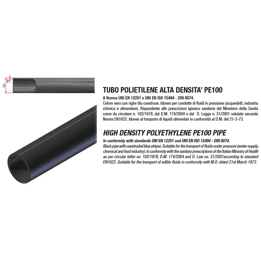 Il tubo NADIR (PE 100) è conforme ai requisiti delle vigenti normative UNI EN 12201 e ISO 4427 per la distribuzione di fluidi in pressione e della UNI EN ISO 15494 per il trasporto di fluidi industriali. È idoneo al trasporto di acqua ad uso umano in quanto conforme al D.M. n° 174/2004, alle prescrizioni del D.lgs. n°31/2001 e successive modificazioni e integrazioni e, per quanto riguarda le caratteristiche organolettiche dell’acqua trasportata, è conforme alla UNI EN 1622. È idoneo inoltre al trasporto di liquidi alimentari in conformità al D.M. del 21 Marzo 1973 e sue successive modifiche e integrazioni.