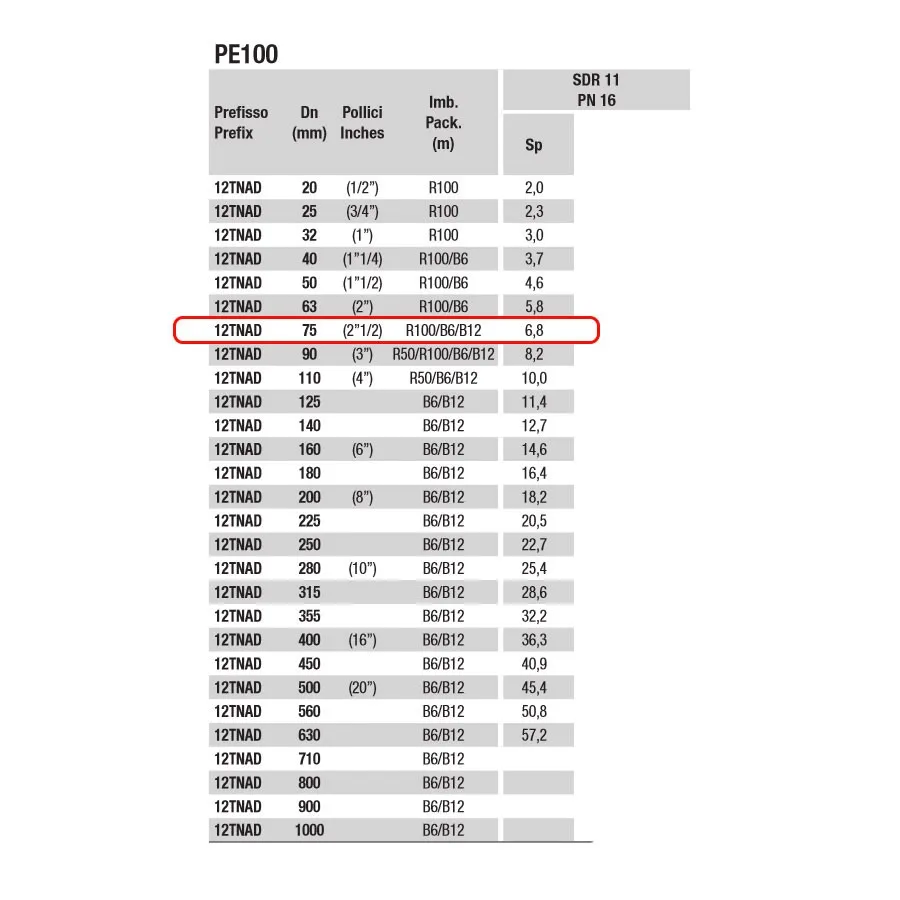 Tubo in polietilene ad alta densità PE100 Nadir ø75 (diam.est.) PN16 SDR11 - Rotolo da 50 metri (prezzo al metro - acquisto minimo di 50 metri o multipli) 12TNAD07516R50 12TNAD07516R50