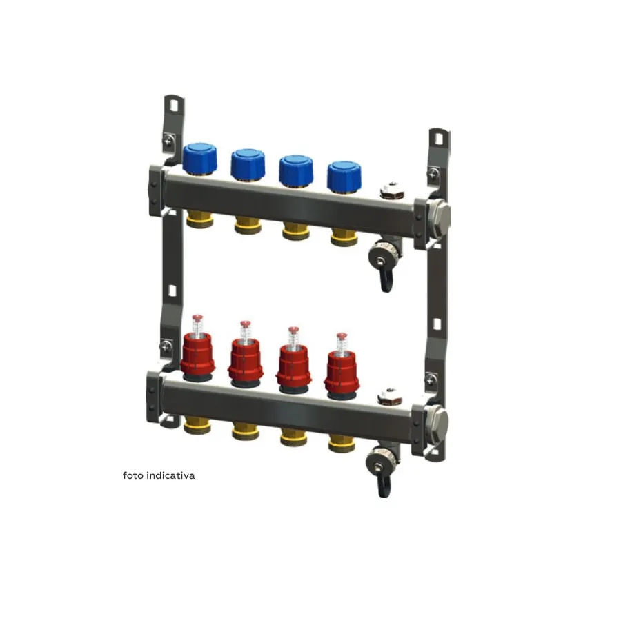 Collettore premontato in acciaio inox composto da: 1 collettore di mandata completo di valvole e flussimetri; 1 collettore di ritorno completo di valvole di intercettazione predisposte per comando elettrotermico; 2 zanche di sostegno.