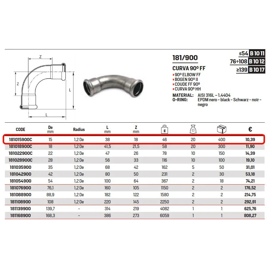 Curva 90° FF ø15 Inox 316L a pressare 181015900C - - RACCORDERIE METALLICHE - - 181015900C