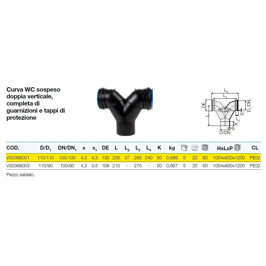 Curva WC sospeso doppia verticale, completa di guarnizioni e tappi di protezione ø110/110 mm. Completa di guarnizioni singolo labbro e tappi di protezione PEHD VS0368001 VS0368001