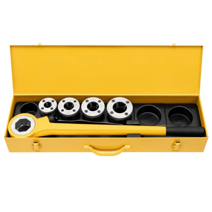 REMS eva Set. Filiera a cricco con bussole a cambio rapido. Per filettatura tubi 2", 16 - 50 mm, filettatura bulloni 6 - 30 mm, 1/4 - 1". Per filettatura destra e sinistra. 1 leva a cricco per l'intera capacità. Bussole a cambio rapido con pettini per filettatura tubi passo gas conico ISO 7-1, EN 10226 (DIN 2999, BSPT) R destro o per filettatura tubi per elettroinstallazioni secondo EN 60423 M.