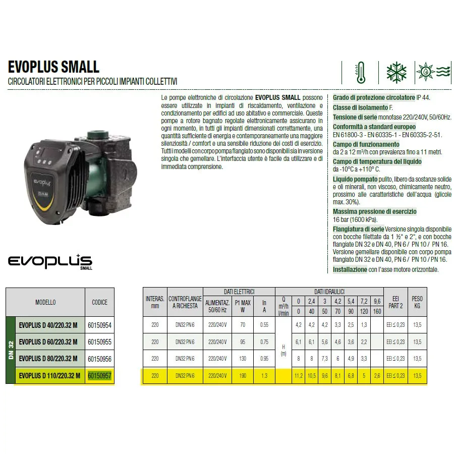 Dab Pumps EVOPLUS SMALL D 110/220.32 M Circolatore elettronico a rotore bagnato per piccoli impianti ad uso abitativo e commerciale 60231370