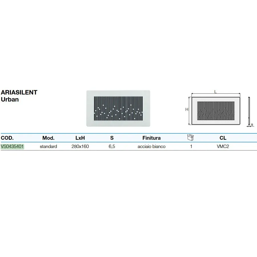 La griglia Valsir AriaSilent Urban è la griglia deputata all'entrata ed alla fuoriuscita dell'aria in impianti di ventilazione meccanica controllata e si abbina alla bocchetta porta griglia AriSilent mediante l'utilizzo del supporto per griglia che garantisce un'unione tra le due dall'elevata solidità e stabilità. La versione Urban standard qui proposta si installa a parete o soffitto negli ambienti interni al fabbricato ed è realizzata in acciaio verniciato di colore bianco opaco dal design moderno e versatile di facile inserimento in qualsiasi ambiente.