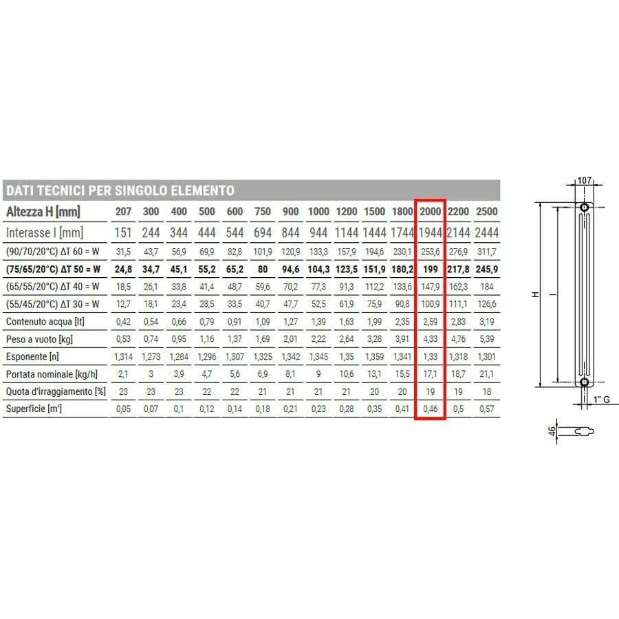 Ardesia radiatore tubolare 3 colonne 5 elementi h.2000 - colore bianco RAL9016 - 4 connessioni aperte con filettatura da 1" 3541706103110