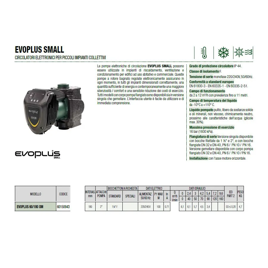Dab Pumps EVOPLUS SMALL 60/180 XM Circolatore elettronico a rotore bagnato per piccoli impianti ad uso abitativo e commerciale, versione singola con bocche filettate da 2", portata max 5.4 m³/h - prevalenza max 6.1 m