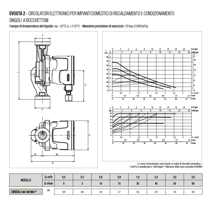 Dab Pumps EVOSTA 2 40-70/180 (1") Circolatore elettronico a rotore bagnato per ricircolo acqua in impianti di riscaldamento e condizionamento, bocche filettate DN25 (G 1" 1/2), portata max 3.6 m³/h - prevalenza max 6.9 m