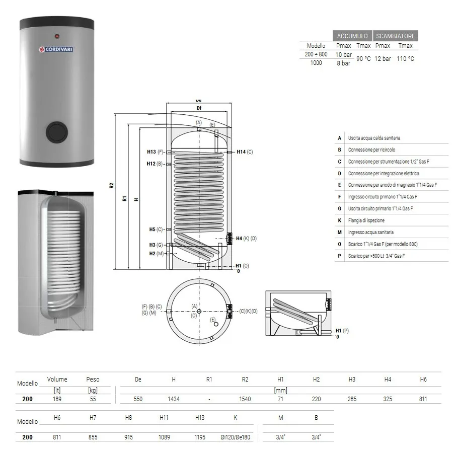 Bollitore verticale BOLLY 1 ST WB 200 litri con 1 scambiatore fisso per produzione A.C.S. 3105162321102